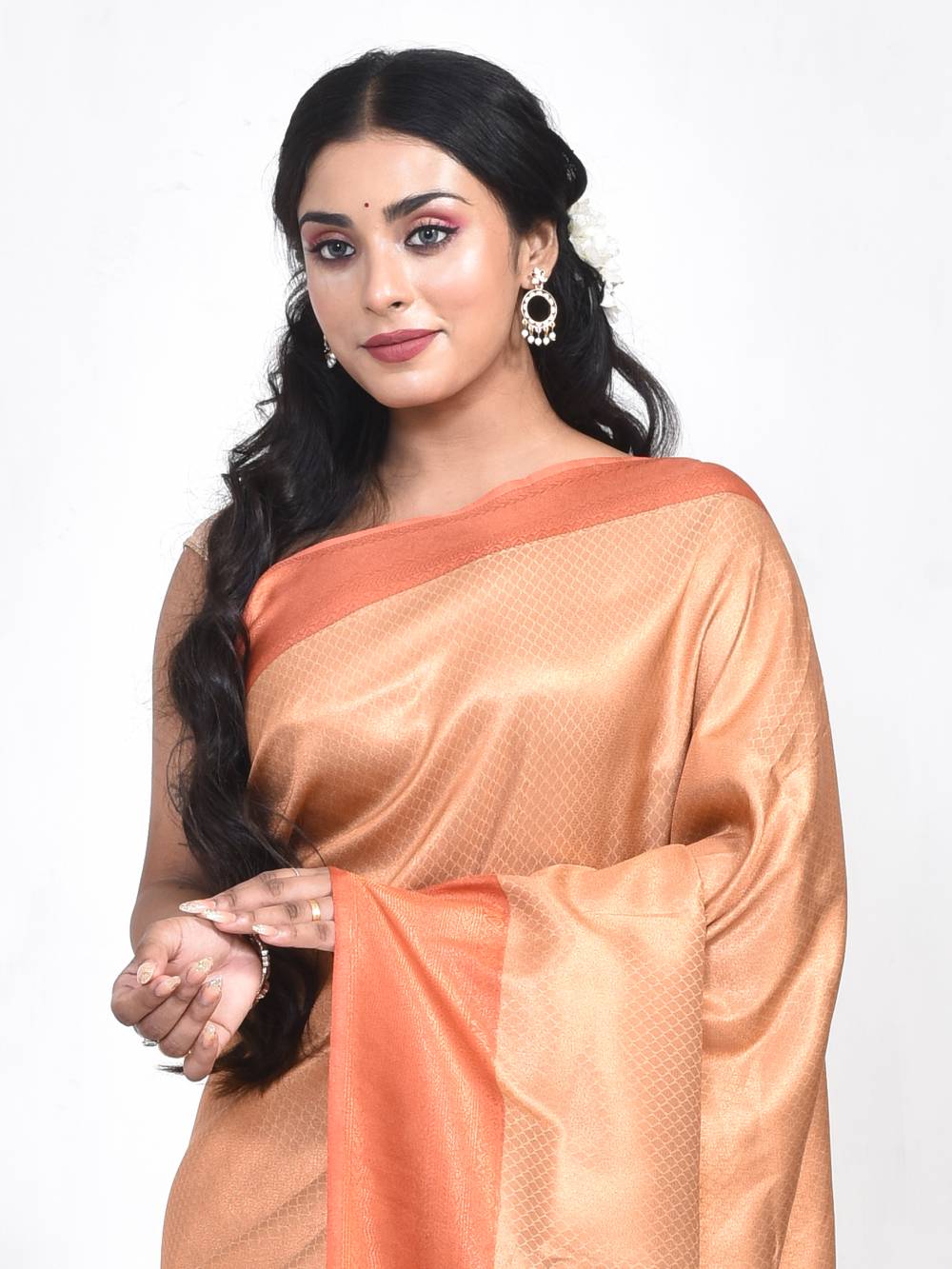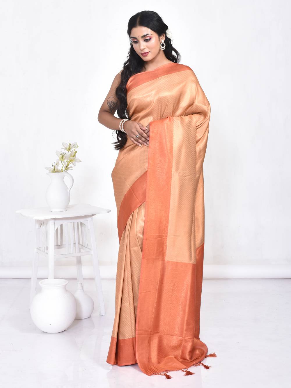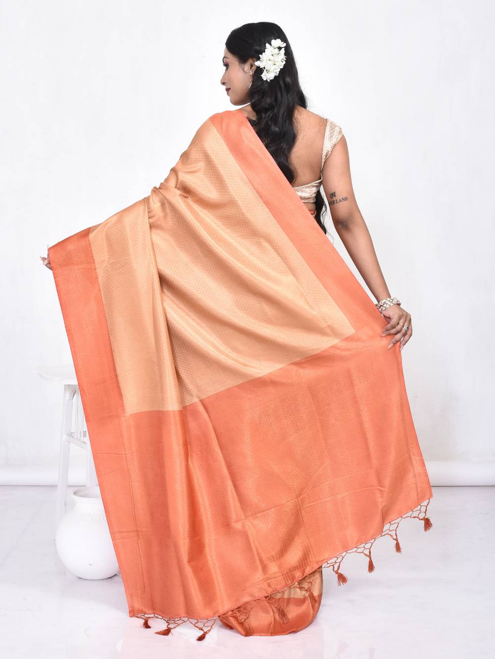 This Saree is a beautiful blend of traditional craftsmanship and modern elegance. Inspired by the timeless allure of Kanjeevaram silk, this saree offers a more affordable and lightweight alternative without compromising on style or grace. The semi-silk fabric provides a soft, smooth drape with a subtle sheen, making it perfect for both everyday wear and special occasions. Adorned with intricate orange diamond pattern, the Kanjeevaram Semi-Silk Saree embodies the grandeur and cultural heritage of Kanchipuram.